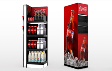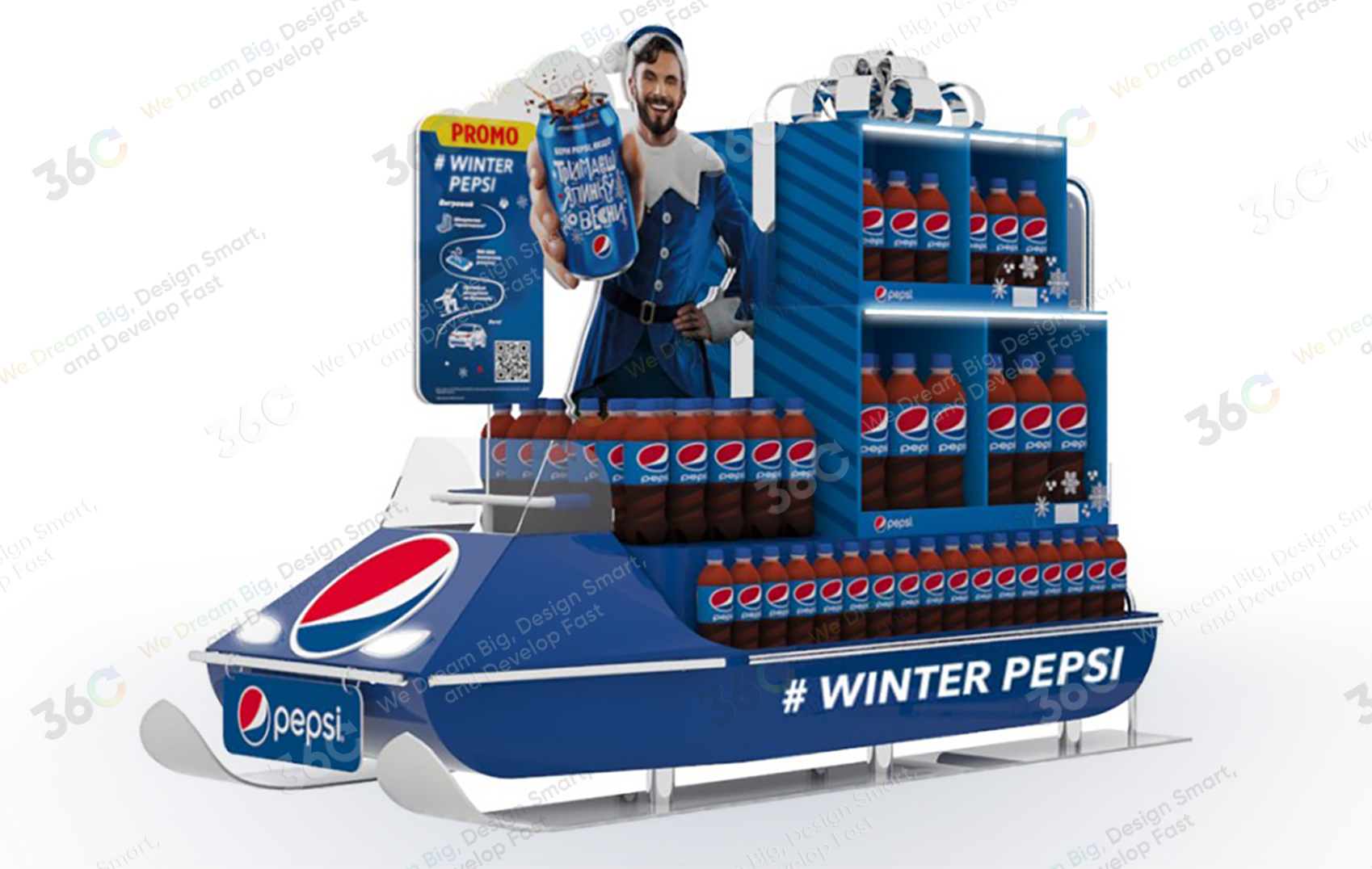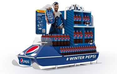 This "snowmobile" stand was designed and engineered by 360 Branding for “Pepsi” brand to increase impulse buys, and promote the product during Christmas period. This stand highlights drive and emotional part of the brand. The product is visible from all sides, and is easily accessible. The stands also use brand colours as well as LED lighting to help them stand out. Due to the slim but fairly large size, it can be easily placed in the middle of the store for maximum exposure to customers.