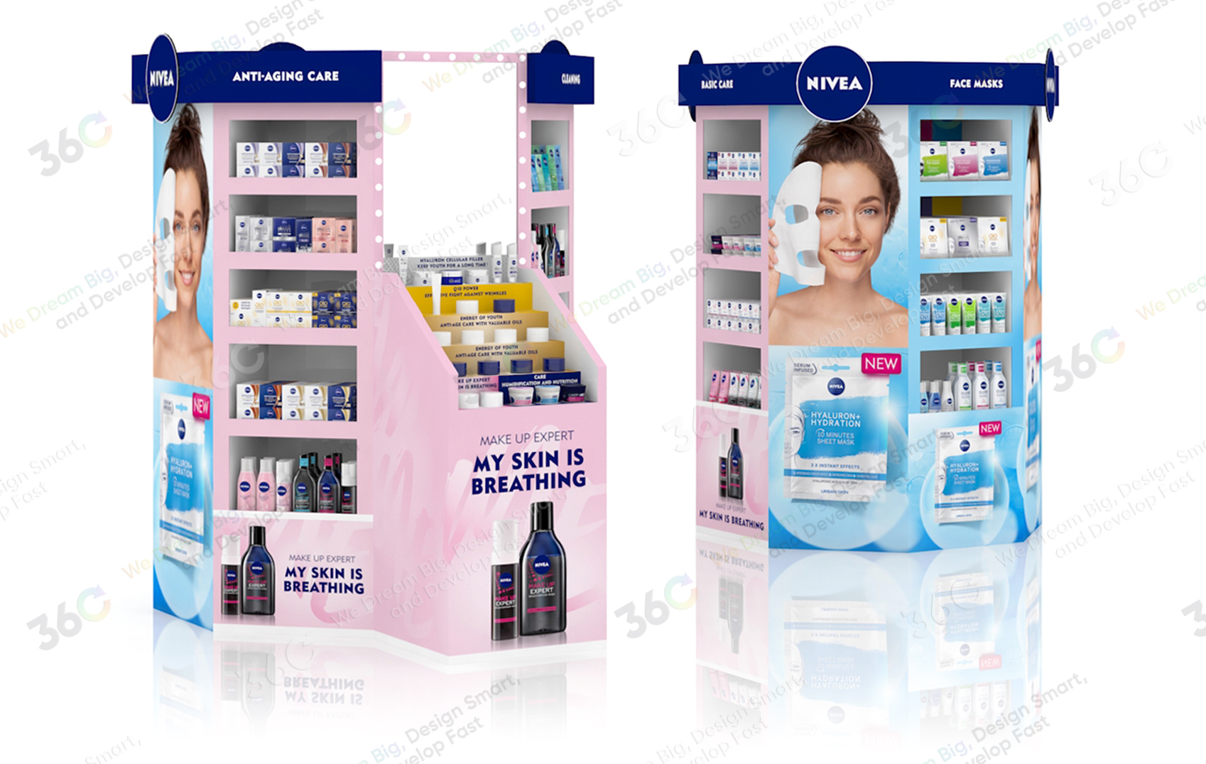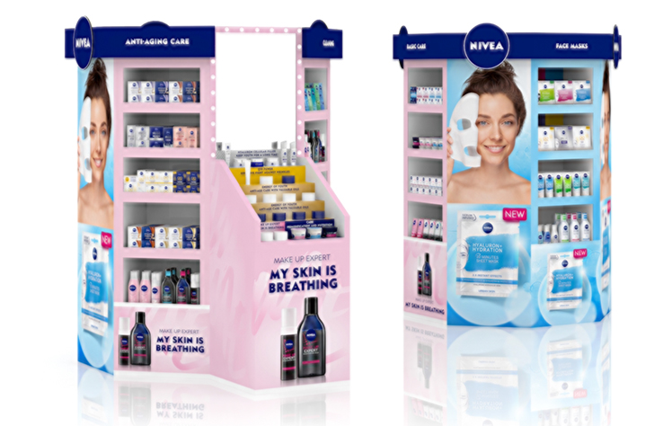 The placing of the entire line of Nivea’s collection of womens products on one stand is already a difficult task. But to design a construction made of cardboard, leaving enough space on it for a large inventory, while providing a place for a tester zone that could be hidden for additional display, is a very bold task that our company has brought to life after careful design methodics. These designs encompass the style and feel of the brand in a robust manner by providing a large product display. Also, we use easily utilized and recyclable materials for this design.